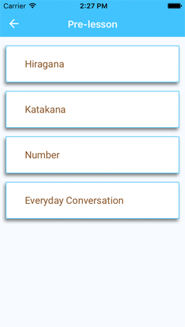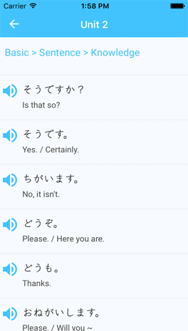- 2. In Word and Sentence parts of Advance level, users will learn vocabularies and sentences commonly used in Japanese daily life and working environment.