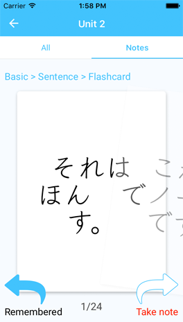 - Notes: For remembered words, flip to the left; flip to the right for unremembered ones, or words which users want to check again.